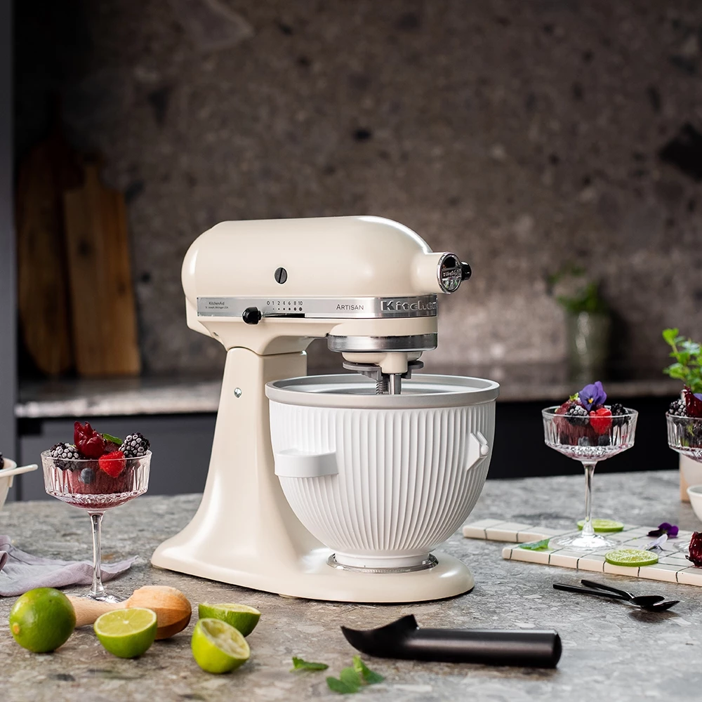 Dieser Zubehör verwandelt Ihre Küchenmaschine in eine Eismaschine für cremiges Speiseeis. Kreieren Sie Slushies, Sorbets und mehr von Grund auf neu.