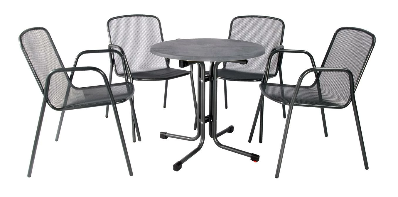 Das Bistroset Mec Fredo aus stabilem, pulverbeschichteten Stahl in Anthrazit überzeugt durch Sitzkomfort und Zweckmäßigkeit. 5-teilig: 4 Stk. Streckmetall-Stapelstuhl „Mec-Fredo“ + 1 Stk. Boulevardklapptisch d=70 cm mit wetterfester Topalit-Tischplatte, Gestellfarben: anthrazit, Plattendekor: beton