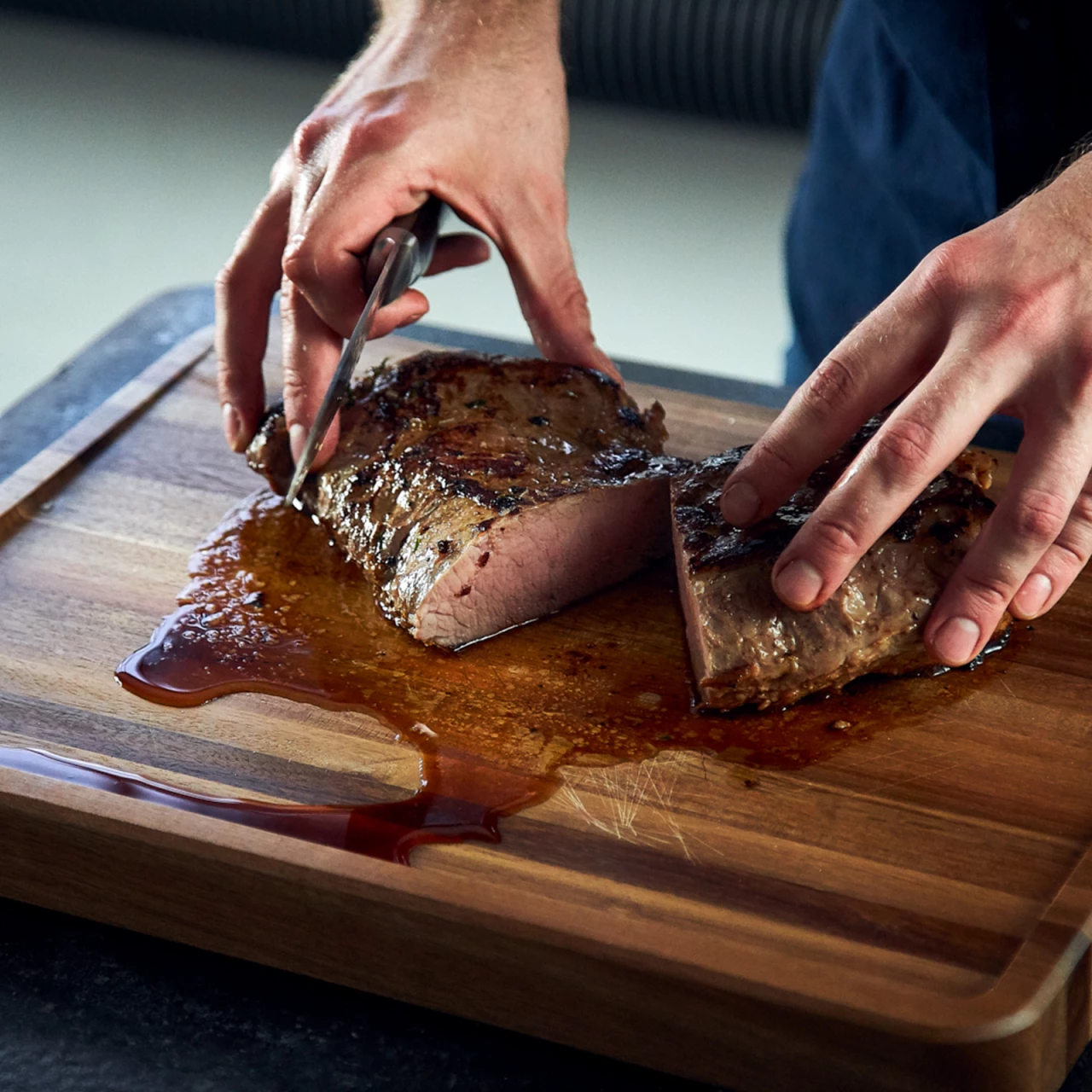 - Ein Brett zwei Seiten: Die obere Seite des Bretts ist leicht angewickelt um wichtige Flüssigkeiten in der Saftkulle aufzufangen, die andere, glatte Seite bietet dir genug Platz für eher trockene Zutaten