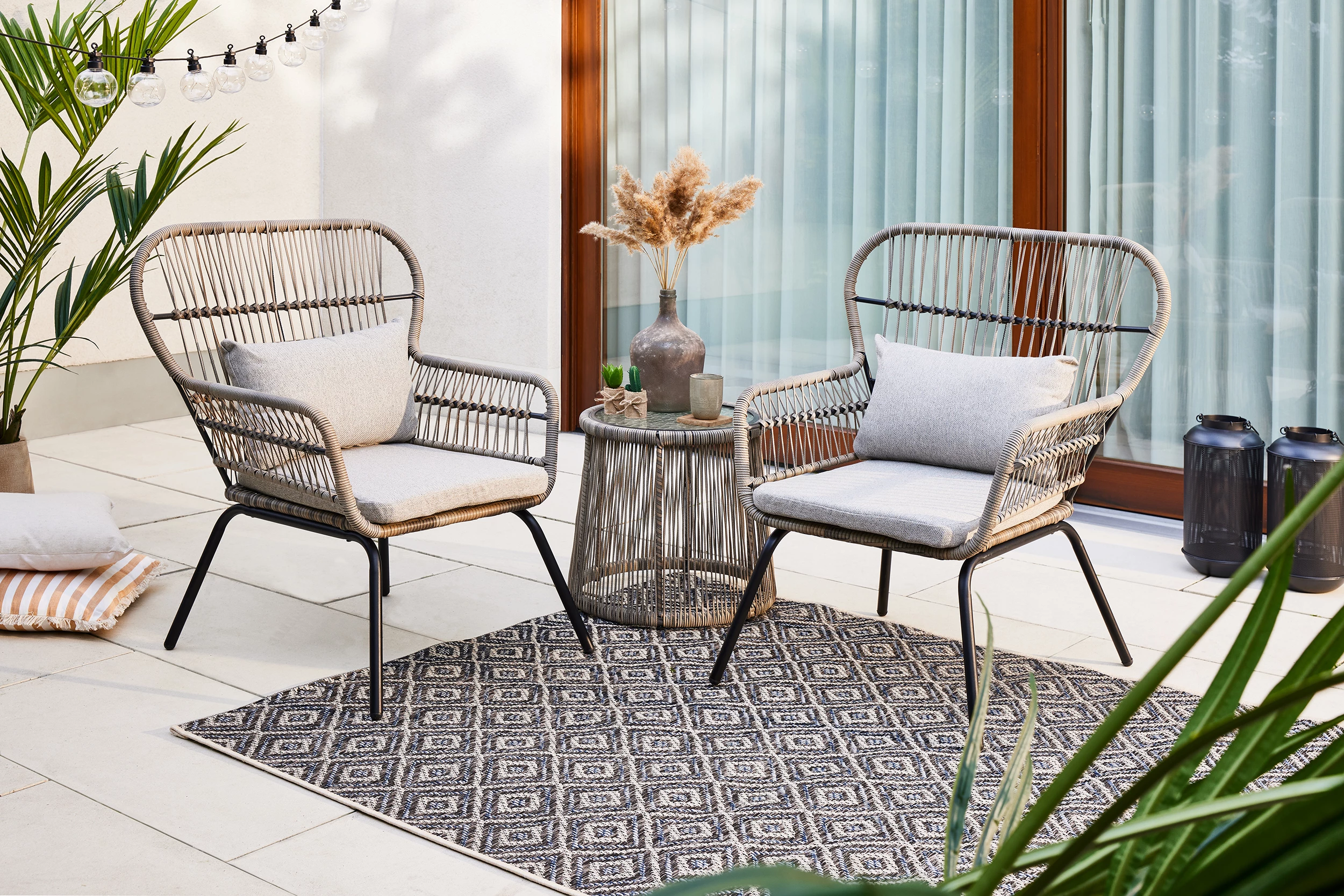 Dieses formschöne Balkonset bietet eine tollen Flair und angenehmen Komfort auf ihrer Terrasse oder ihrem Wohnraum. Genießen Sie den Sommer mit dieser platzsparenden Garnitur aus einem witterungsbeständigen Kunststoffgeflecht . Die farblich abgestimmten Sitz und Rückenkissen bieten einen angenehmen Sitzkomfort.