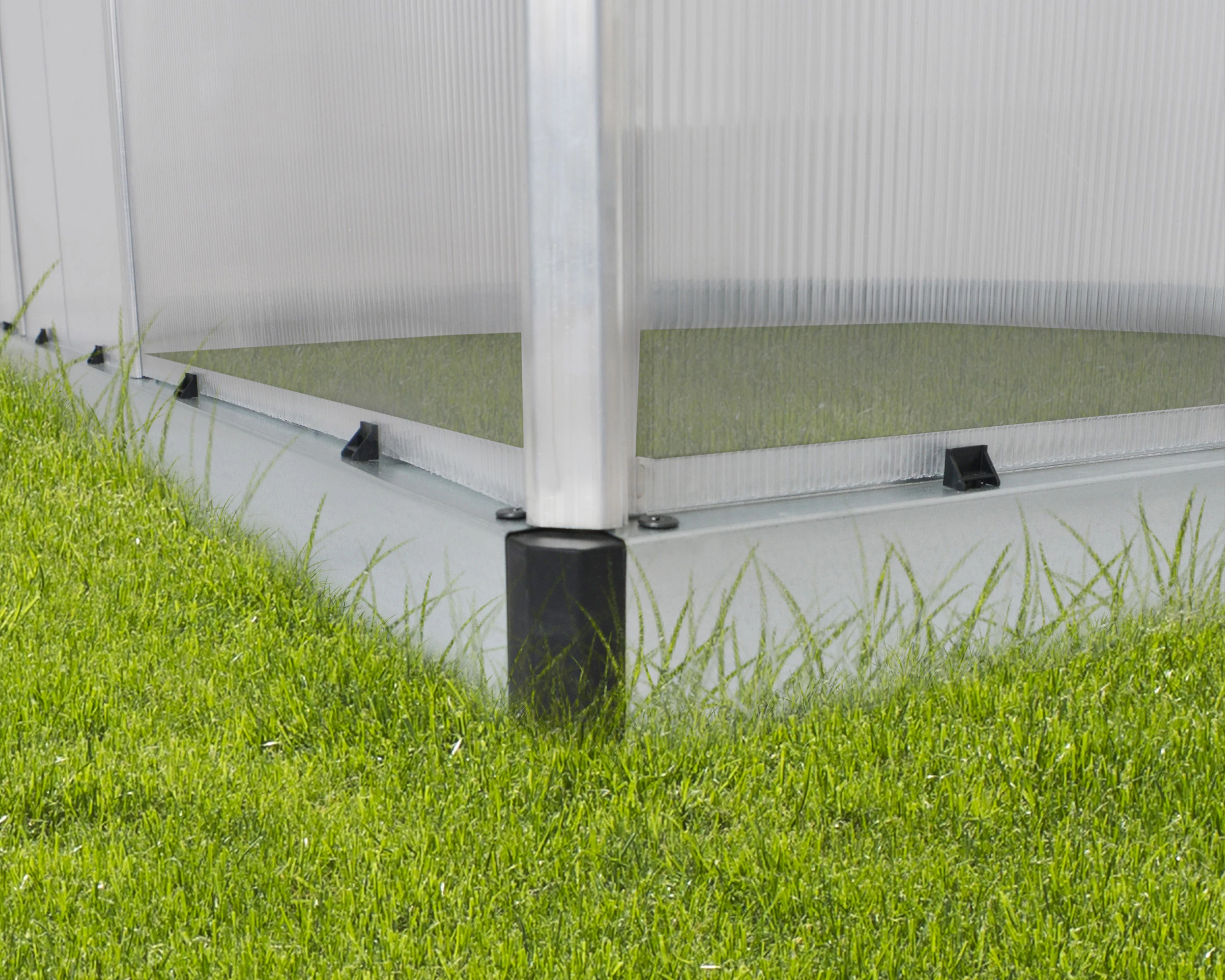 Lieferumfang: Gewächshaus, galvanisierter Stahlfundamentrahmen, Dachfenster, Schwenktür, Regenaublaufrinne