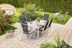Schaffen Sie sich eine attraktive Sitzgelegenheit mit dem Möbel Set New York . Dieser robuste Stapelstuhl, aus pulverbeschichtetem Stahl, ist ideal geeignet für den Einsatz im Garten, auf der Terrasse, auf dem Balkon oder auch im Wintergarten. Die bequeme Sitz- und Rückenfläche dieses Stuhls besteht aus einem wetterfestem Textilenbezug. Für besten Sitzkomfort ist der Gartenstuhl mit seitlichen Armlehnen versehen. Der passende Tisch ist mit einer Sicherheitsglasplatte versehen und somit sehr robust. Lieferumfang: 1 Tisch Rio + 4 Stühle Rio.
