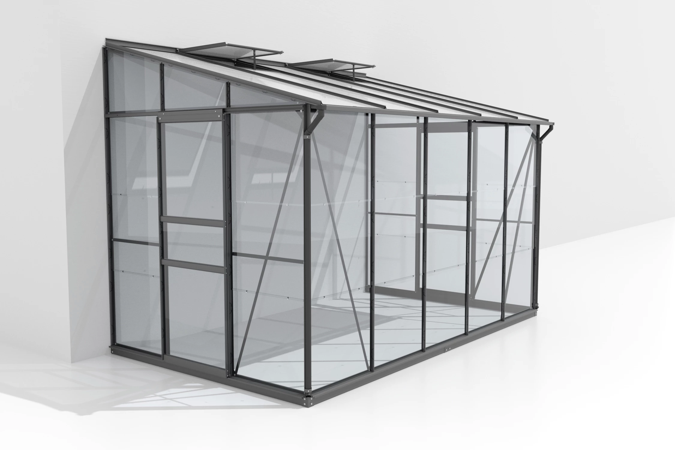 Schön hoch und mit breiten Doppelschiebetüren ausgestattet bietet das Anlehngewächshaus komfortable Rahmenbedingungen für das Hobbygärtnern. Insbesondere hoch wachsende Pflanzen finden unter dem 1,69 m bis 2,22 m hohen Pultdach genug Entfaltungsraum. Ein bis zwei Dachfenster schaffen in Kombination mit den Schiebetüren optimale Be- und Entlüftungsmöglichkeiten. Im Unterschied zum Balkonhaus gibt es noch mehr Verglasungsoptionen: HKP 4 und 6 mm sowie die Kombiverglasung mit HKP im Dach und schönem Sicherheitsglas, kristallklar (ESG) in den Seiten. Alle Styx und Osiris Modelle sind in Aluminium eloxiert, schwarz oder Smaragd pulverbeschichtet erhältlich. Passend zu allen Modellen ist ein 6 cm hoher Fundamentrahmen aus verzinktem, farbbeschichtetem Stahlblech als Zubehör lieferbar. Die Balkon- bzw. Anlehngewächshäuser der Serie Styx und Osiris können nicht freistehend aufgestellt werden! Eine Hauswand oder stabile Mauer als Rückwand ist notwendig.