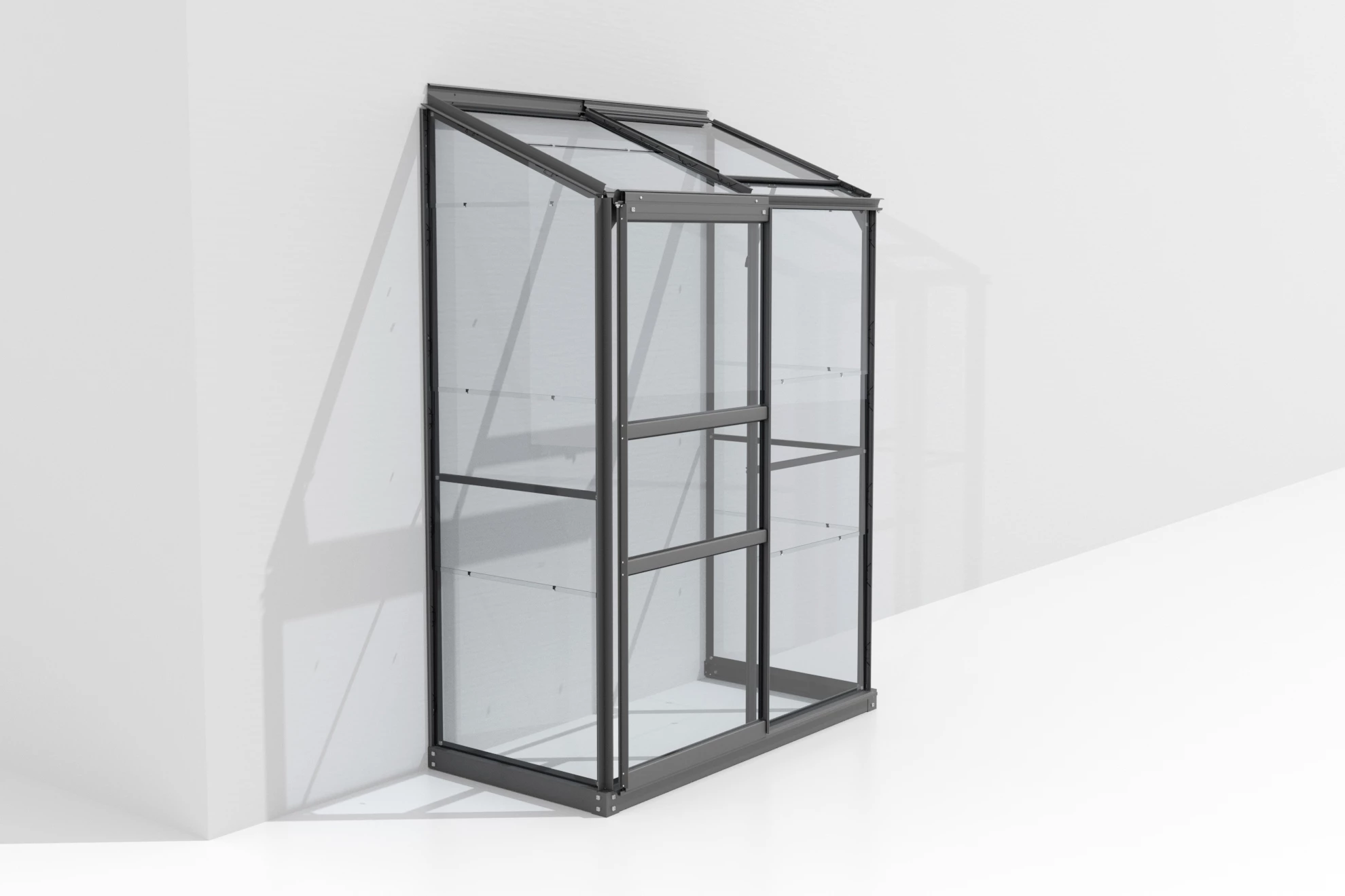 Mit Grundflächen ab 0,9 m² ermöglicht das Anlehnhaus Styx selbst auf kleinen Balkonen und Terrassen das Hobbygärtnern. Die hohe Schiebetür öffnet sich mühelos, sodass der direkte Zugriff auf das angebaute Gemüse im Gewächshaus gewährleistet ist. Das mitgelieferte Dachfenster bietet eine zusätzliche Belüftungsmöglichkeit. Die Styx Modelle werden wahlweise mit Hohlkammerplatten (HKP) in ca. 4 mm Stärke aus UV-stabilisiertem Polycarbonat oder mit ca. 3 mm starkem Sicherheitsglas, kristallklar (ESG) eingedeckt.