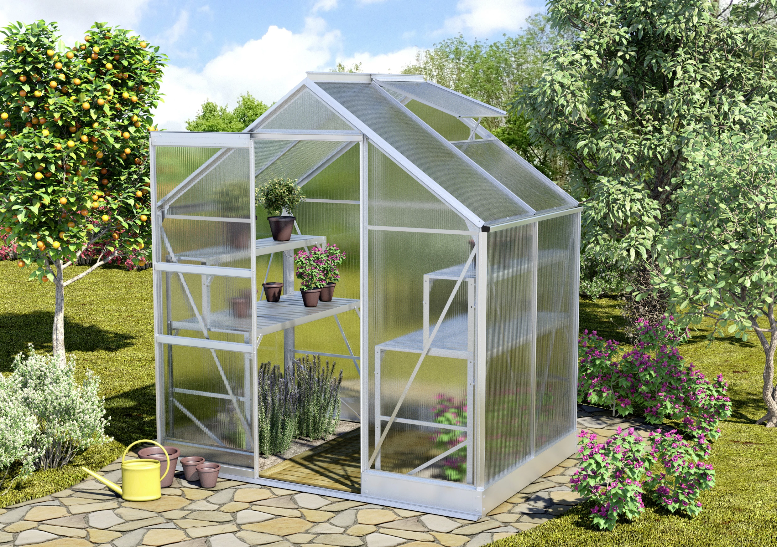 Das Apollo bietet alles, was der Einsteiger zum Gewächshausgärtnern braucht, und überzeugt obendrein mit dem kleinen Extra an Komfort. Mit Grundflächen von 2,5 bis 6,2 m², filigranen Aluminiumprofilen und einer Eindeckung mit Hohlkammerplatten (HKP) ebnet unser Apollo den Weg ins Neuland Gewächshausgärtnern: Einsteiger wählen aus den vier verschiedenen Größen die Anbaufläche, die sie meistern können. Sie bestücken das Haus je nach gewünschten Isoliereigenschaften mit jeweils ca. 4 oder 6 mm HKP. Mit der umfangreichen Standardausstattung können Sie sich sicher sein, dass alles Nötige da ist: Stahlfundamentrahmen, Dachfenster für die Be- und Entlüftung sowie Regenrinnen zum Sammeln von Regenwasser. So startet der Hobbygärtner ohne Stolperfallen in die neue Garten-saison. Und das nicht nur im übertragenen Sinne: Die bodentiefe Türschwelle erlaubt den barrierefreien Zugang durch die 1,74 m hohe und 0,61 m breite Tür und verhindert so ein Stolpern, auch wenn der Sack Blumenerde auf dem Arm einmal die Sicht nach unten versperrt. Ob in Alu eloxiert, Smaragd oder Anthrazit pulverbeschichtet: Dank ihrer Oberflächenbehandlung sind die Profile optimal gegen Korrosion und Verwitterung geschützt.