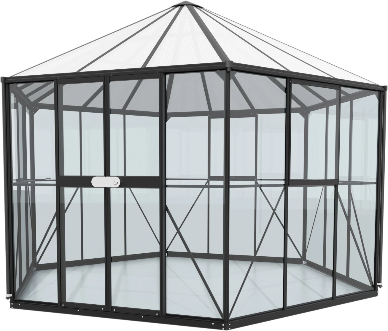 Nicht nur Ihre Pflanzen werden das Juno lieben: Der Pavillon besticht durch seine elegante Erscheinung, die ihn zu einem Schmuckstück unter den Gewächshäusern macht. Mit einer Höhe von 263 bis 283 cm bietet das Juno dem Gärtner einen bequemen Zugang und eine angenehme Stehhöhe im Gewächshaus. In dem Juno 4500 finden Sie auf 4,5 m² gemütlichen Rückzugsraum für sich und Ihre Lieblingsblumen. Zur Auswahl stehen drei Farben: Aluminium eloxiert sowie Smaragd oder Weiß pulverbeschichtet. Zur Standardausstattung gehören ein Stahlfundamentrahmen, 2 Lamellenfenster, Zwangsentlüftung im Dach und eine Schiebetür mit einer Breite von 62 cm und einer Höhe von 177 cm. In dem Juno 9000 finden neben dem Gärtner auch Familienmitglieder und gute Freunde Platz, um ihm zur Hand zu gehen oder einfach nur die grüne Pracht im Gewächshaus zu bewundern. Der formvollendete Aluminiumpavillon Juno 9000 ist serienmäßig mit einem Stahlfundamentrahmen, Regenrinne, drei Regenfallrohren, drei Seitenfenstern, Zwangsentlüftung im Dach und einer komfortablen Doppelschiebetür mit hochwertigem Zylinderschloss ausgestattet. Die Tür hat eine Breite von 80 cm und eine Höhe von 177 cm. Zur Auswahl stehen vier Farben: Aluminium eloxiert, Smaragd, Weiß oder Schwarz pulverbeschichtet. In beiden Häusern werden die Seiten mit Abdeckleisten aus PVC befestigt. Im Dach des Juno 9000 werden die ca. 6 mm starken, UV-stabilisierten Hohlkammerplatten (HKP) zusätzlich mittels einer innovativen Einschubtechnik befestigt, bei der die Platten einfach in die Profile geschoben werden. Diese schützen die Pflanzen gegen zu starke Sonneneinstrahlung und sorgt für eine ausgeglichene Temperatur. Die Seitenwände sind mit Sicherheitsglas, kristallklar (ESG) ca. 3 mm verglast. Das Höhenmaß ist inkl. Fundamentrahmen gemessen.