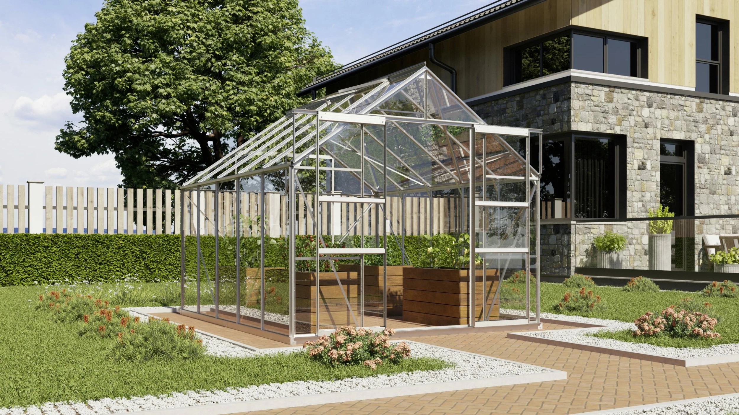 Durch sein großzügiges und offenes Design lädt das Mars den aktiven Gärtner zum Arbeiten und Genießen ein. Dieses Modell eignet sich für den fortgeschrittenen Gärtner. An sonnigen, heißen Tagen sollte das Glas jedoch abschattiert werden, um die Pflanzen vor Verbrennungen zu schützen. Das Modell hat ein kittloses Verglasungssystem mit rostfreien Glasfederklammern und eine leichtgängige, kugelgelagerte Doppelschiebetür mit einer Breite von 122 cm und einer Höhe von 175 cm. Jedes Modell ist serienmäßig mit zwei Dachfenstern und Regenrinnen ausgestattet.
