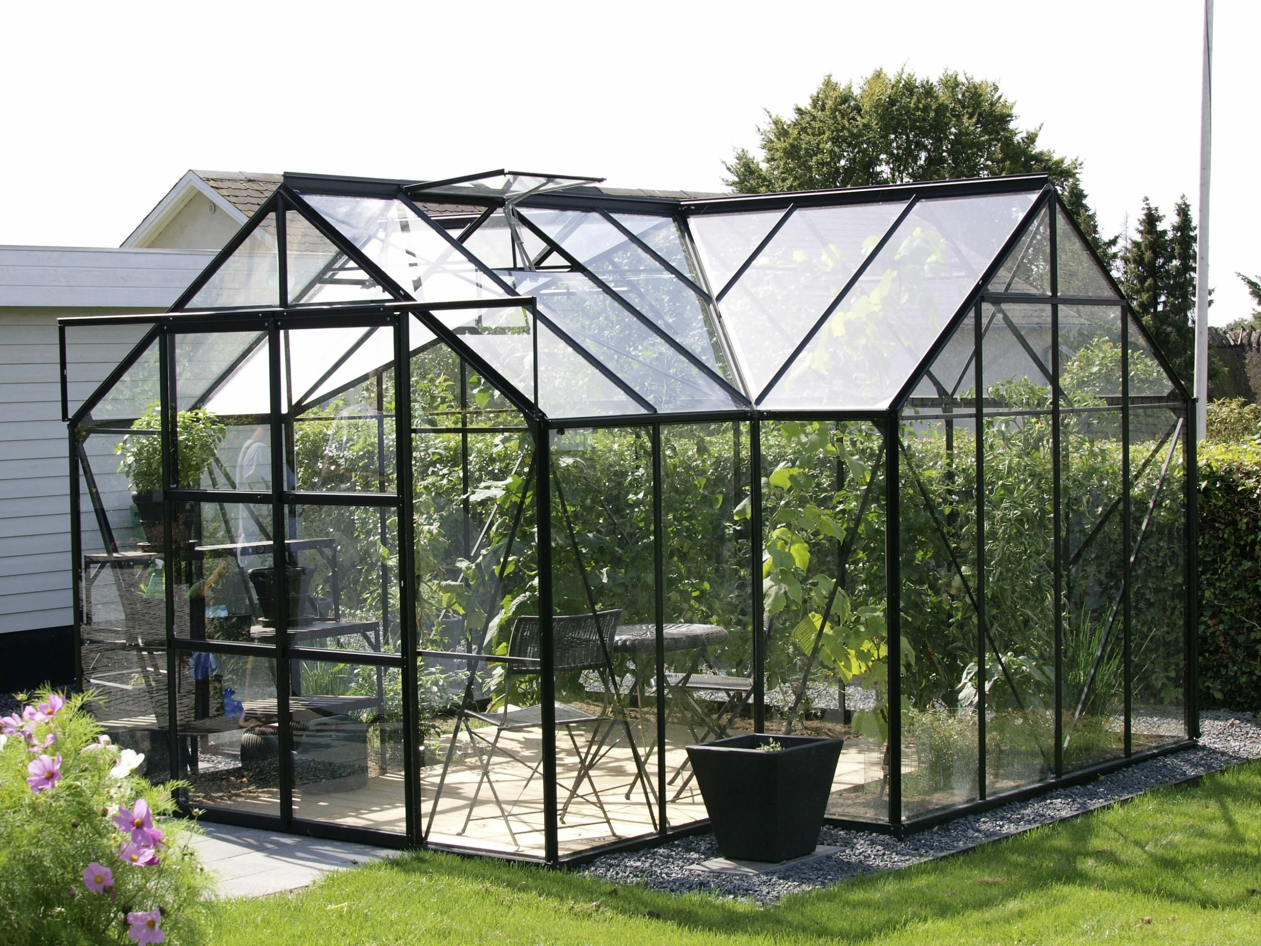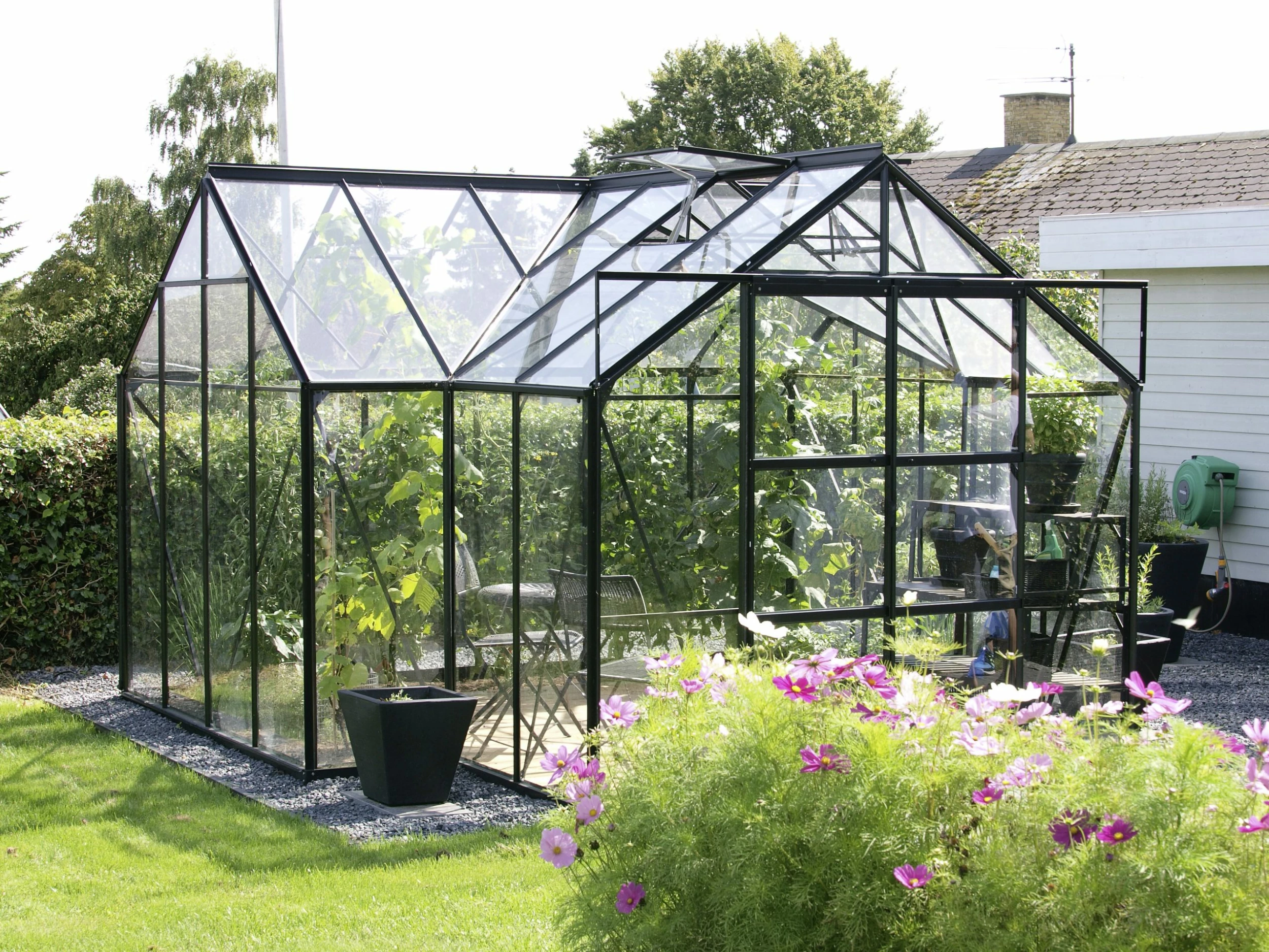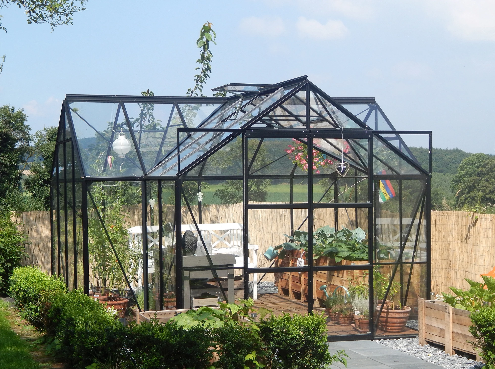Extravagante Form und Vollverglasung machen das Sirona zu einem besonderen Ort mit viel Flair, Licht und Ausstrahlungskraft. Dieses Gewächshaus im Stil der barocken Orangerie besteht aus korrosions- und witterungsbeständigen Aluminiumprofilen und ist vollverglast mit ca. 3 mm starkem Sicherheitsglas, kristallklar (ESG). Die Grundfläche beträgt ca. 13 m². Es ist erhältlich in drei Farbvarianten: in Aluminium eloxiert, Smaragd oder Schwarz pulverbeschichtet. Das Gewächshaus wird zusammen mit einem ca. 6 cm hohen Stahlfundamentrahmen geliefert. Das Modell hat eine leichtgängige, kugelgelagerte Doppelschiebetür mit einer Breite von 122 cm und einer Höhe von 191 cm. Das Sirona ist serienmäßig mit vier Dachfenstern, Regenrinnen und drei Regenfallrohren (L 1,50 m, Ø 32 mm) ausgestattet. Somit ist für eine optimale Belüftung, einwandfreies Abfließen sowie Sammeln von Regenwasser gesorgt. Außergewöhnlich sind außerdem die Höhen von Traufe (160 cm) und First (254 cm). Diese Orangerie kann mit weiteren Doppelschiebetüren an den Giebelseiten rechts oder links ausgestattet werden. Zusätzlich können Sie das Gewächshaus mit einer Firstkrone verschönern, die gleichzeitig z.B. auch als Taubenabwehr dient.