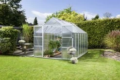 Freiraum zur Entfaltung: Hochwachsende Pflanzen wie auch große Gärtner haben an dem Uranus viel Freude, weil genug Platz für beide da ist. Ein Traum für alle Pflanzenliebhaber! Das Uranus ist ein Modell für den fortgeschrittenen Gärtner. Mit seiner außergewöhnlichen Firsthöhe von 246 cm und der Traufenhöhe von 151 cm bietet das Uranus auch hohen Pflanzen viel Raum. Das Modell hat ein kittloses Verglasungssystem mit rostfreien Glasfederklammern und eine leichtgängige, kugelgelagerte Doppelschiebetür mit einer Breite von 122 cm und einer Höhe von 191 cm.