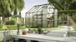Freiraum zur Entfaltung: Hochwachsende Pflanzen wie auch große Gärtner haben an dem Uranus viel Freude, weil genug Platz für beide da ist. Ein Traum für alle Pflanzenliebhaber! Das Uranus ist ein Modell für den fortgeschrittenen Gärtner. Mit seiner außergewöhnlichen Firsthöhe von 246 cm und der Traufenhöhe von 151 cm bietet das Uranus auch hohen Pflanzen viel Raum. Das Modell hat ein kittloses Verglasungssystem mit rostfreien Glasfederklammern und eine leichtgängige, kugelgelagerte Doppelschiebetür mit einer Breite von 122 cm und einer Höhe von 191 cm.